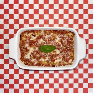 Zapiekany makaron penne z sosem pomidorowym, sosem beszamelowym, mozzarellą fior di latte, parmezanem i bazylią