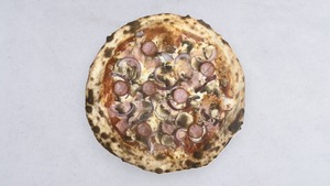 kiełbasa, szynka prosciutto cotto, pieczarki, czerwona cebula, mozzarella fior di latte, sos pomidorowy, oregano