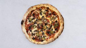 salami pepperoni, jalapeño, pieczarki, oliwki, mozzarella fior di latte, sos pomidorowy, oregano