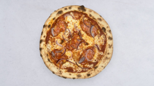 salami piccante, nduja, jalapeño, czerwona cebula, mozzarella fior di latte, sos pomidorowy, oregano
