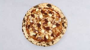 sos bbq, kurczak, jalapeño, kukurydza, czerwona cebula, mozzarella fior di latte, sos pomidorowy, oregano