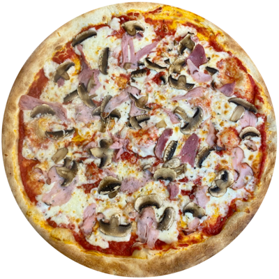 szynka prosciutto cotto, pieczarki, mozzarella fior di latte, sos pomidorowy, oregano