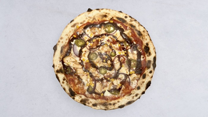 sos bbq, kurczak, jalapeño, kukurydza, czerwona cebula, mozzarella fior di latte, sos pomidorowy, oregano