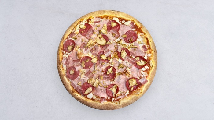 szynka prosciutto cotto, boczek, salami, kurczak, mozzarella fior di latte, sos pomidorowy, oregano